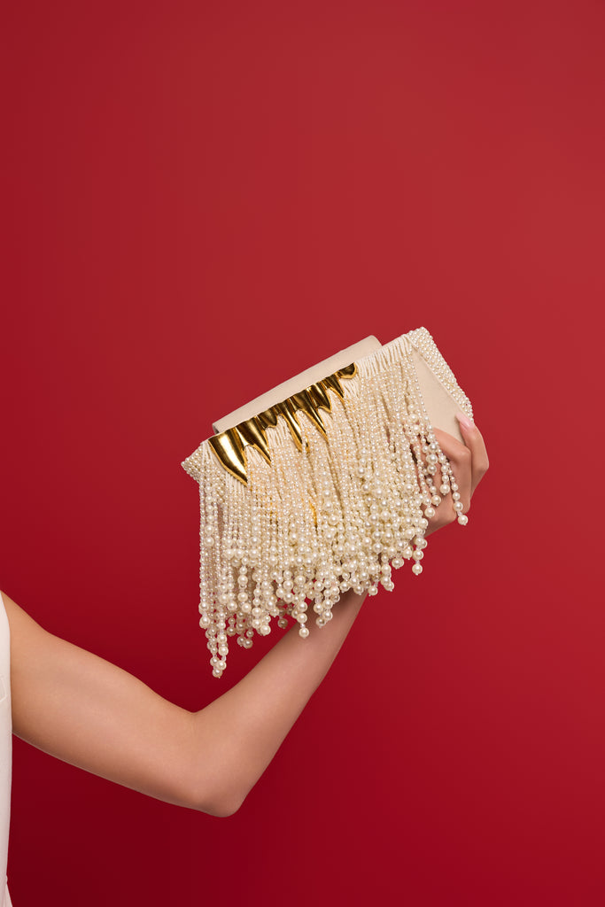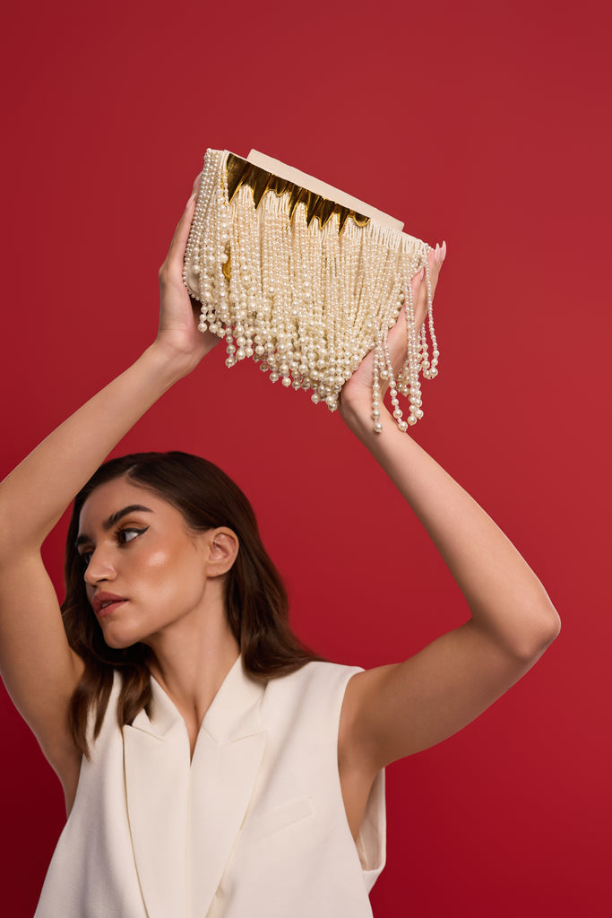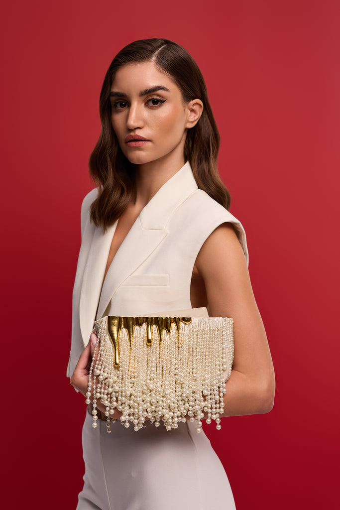 The Right SidedThis one’s special, fun, playful and artistic. Our Lumi is everything we ever wanted a bag to be. It fits almost everything you need yet looks so chic. The metal drip merger effortlessly with the hand strung pearl and crystal tassels. This bag is perfect for all your special occasions.